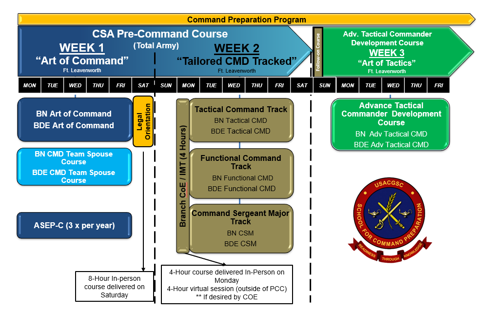 The school began in 1984 with a modest series of courses, but over the past four decades, the program grew significantly. Although the format of the education varied considerably over the years, the school continued to expand in scope, scale, and attendance year by year. This reflects Army Senior Leaders’ long held belief that battalion and brigade command positions are the most consequential and transformational leadership roles in the Army. Command preparation education is an investment in the readiness, cohesion, discipline, trust, and tactical level leadership of the entire Army. Today, the Command Preparation Program is a Total Army system that educates thousands of leaders annually in the art and science of command leadership from company through division level commands. The program is unique in its depth and dimensions, and it has no equivalent in the U.S. Joint Force or the armies of our allies and partners. In addition to serving as the executive agent for the Command Preparation Program, the School for Command Preparation assists in the synchronization and communication between 29 courses at 14 locations across the Army. SCP executes 11 resident courses at Fort Leavenworth, including the center of gravity of the program, the Chief of Staff of the Army’s Core Courses for Battalion and Brigade as well as the Command Team Spouse Development Program, Tactical Commander Development Courses, Functional Commander Development Courses, Command Sergeant Major Development Courses, and Army Strategic Education Program- Command. SCP also manages and maintains the curriculum and lesson plans for the Total Army’s Company Commander and First Sergeant Pre-Command Course.